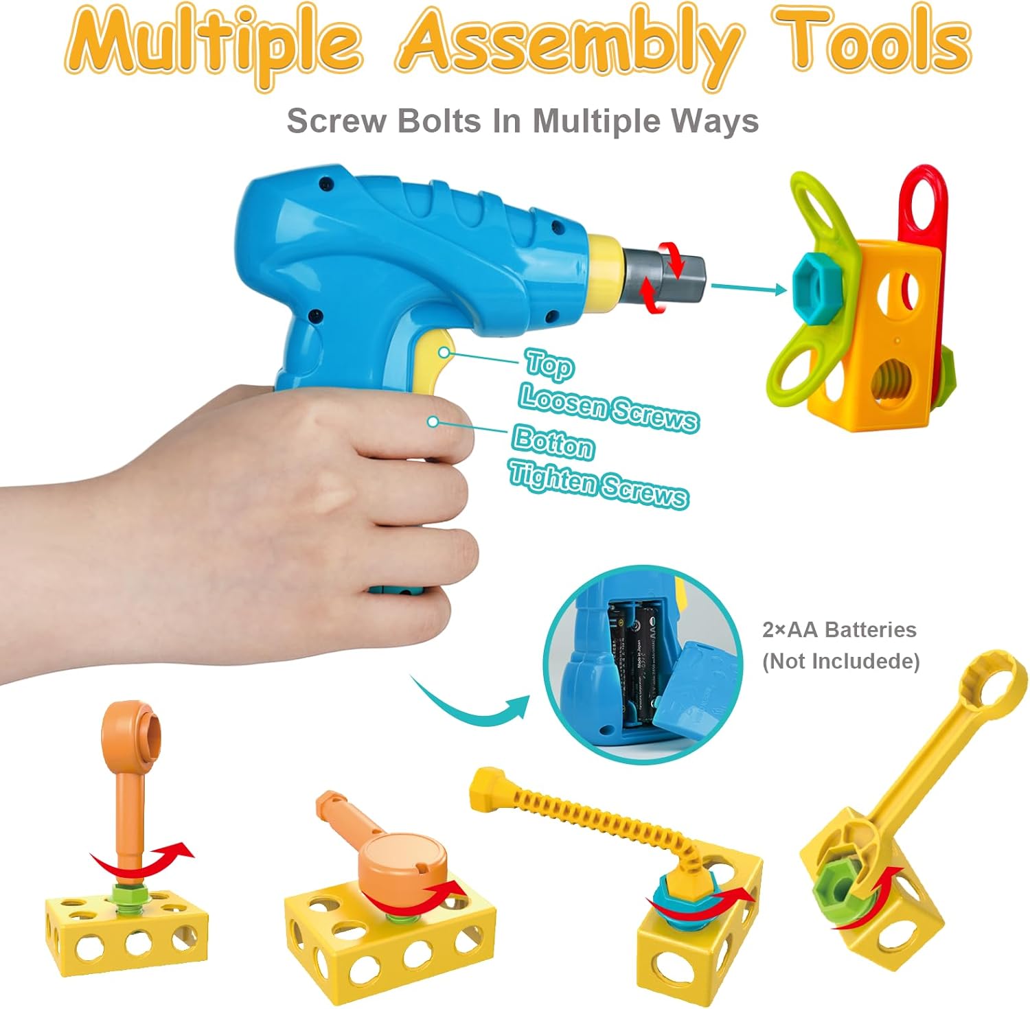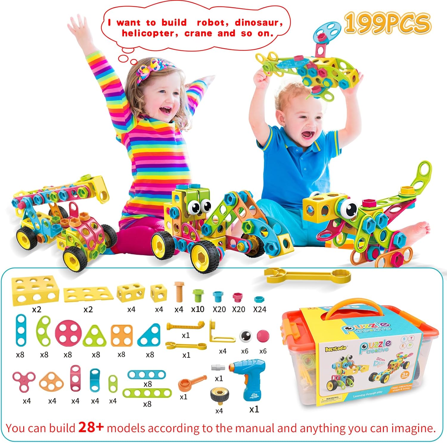 [28 Models STEM Building Set with Electric Drill] Our toy building sets include 199 pieces of colorful & varied shapes blocks and electric drill, equipped with a storage box and an assembly booklet. Kids can build 28 models according to the manual, like elephant, robot, dinosaur, helicopter, crane and anything kids can imagine. Cool building toys for kids ages 4-8 6-8, building blocks toys for toddlers 3-5.