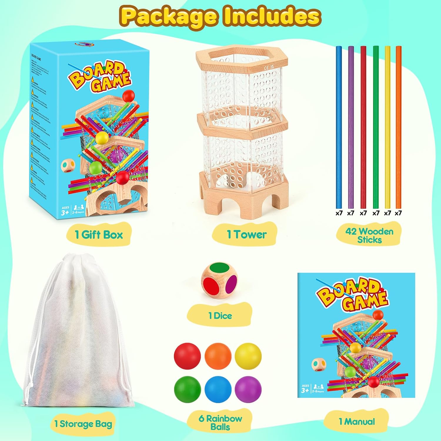 Simple Rules, Exciting Family Game: Players take turns rolling the dice and removing colored sticks – don’t let the ball fall! Whoever drops the least balls wins. Easy setup and fast gameplay make this wooden board game a hit for kids and parents. Encourages turn-taking, decision-making, and laughter during playdates or family nights