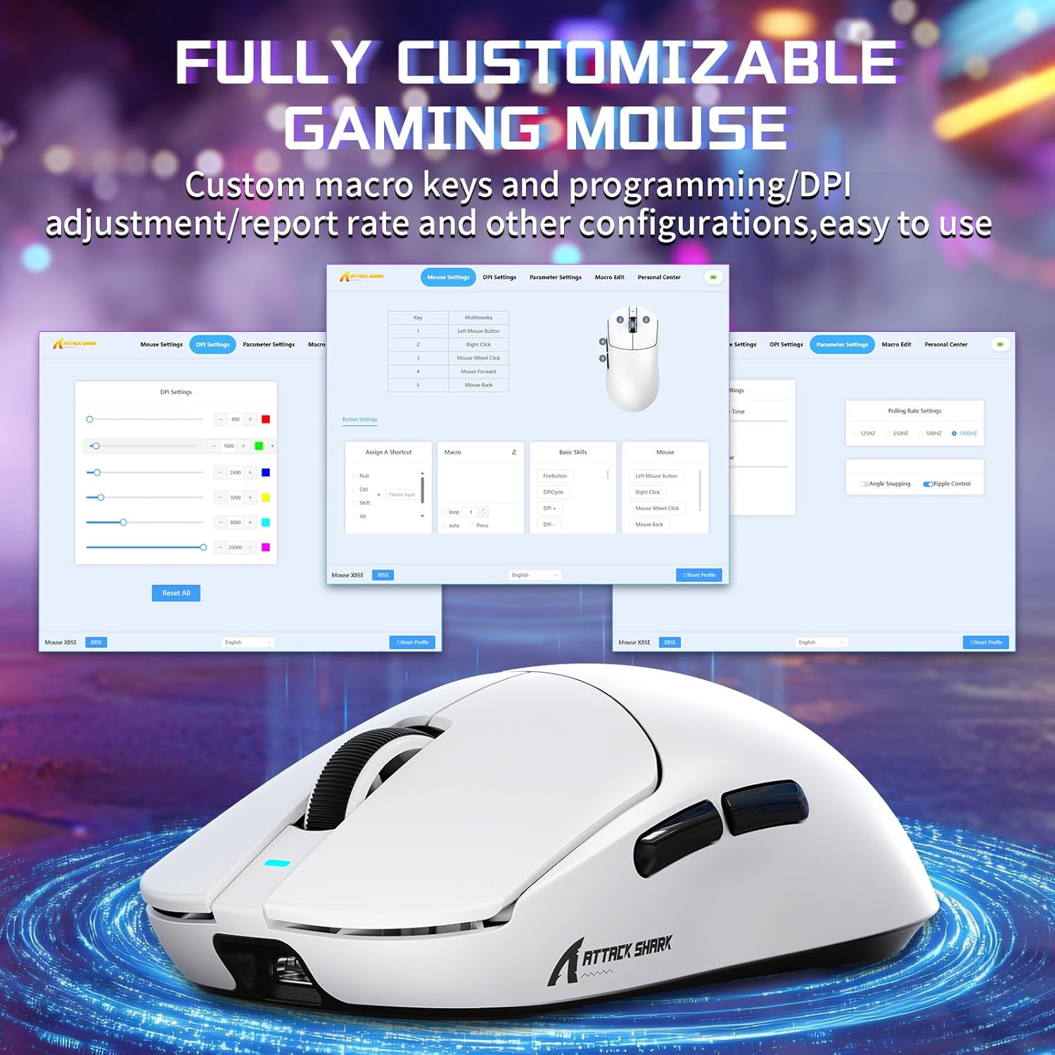 【BK52820 MCU Chip & PAW3311 sensor Combo】 ATTACK SHARK X8SE adopt the PixArt PAW3311 gaming sensor and Broadcom BK52820 MCU chip, delivering zero latency and pixel-perfect tracking. This mouse allows you to fine adjust the DPI from 100 to 25000, and 4 adjustable polling rates ( 125Hz-250Hz-500Hz-1000Hz),tracking speed 400IPS,acceleration 40G. You can easily adjust the moving speed, and experience a smooth, fast response and accurate tracking gaming experience.