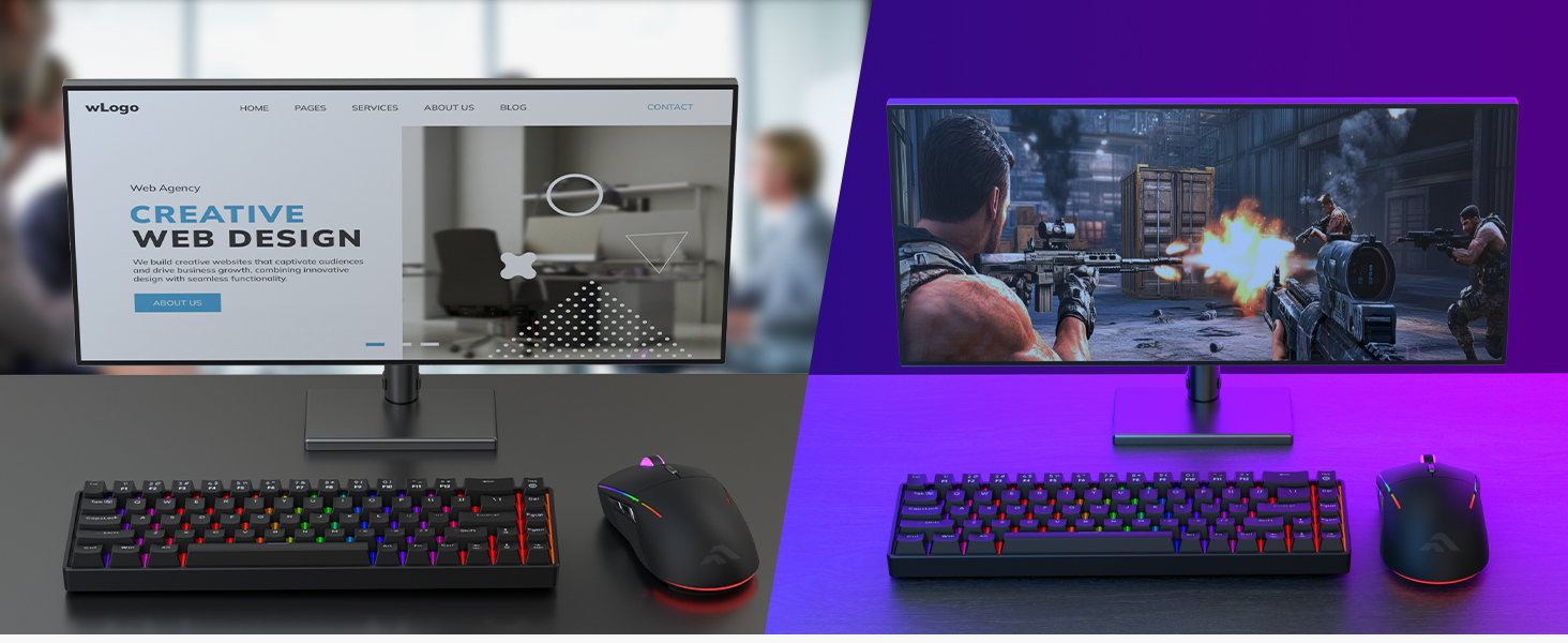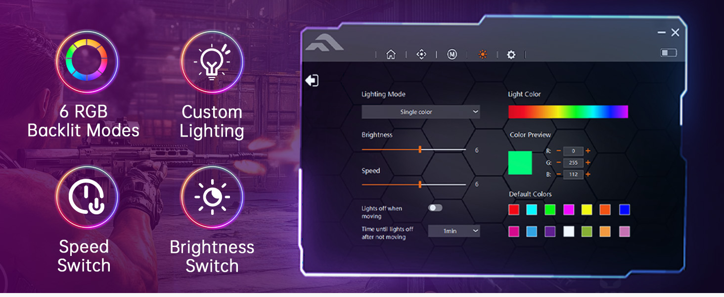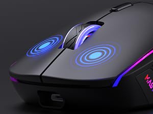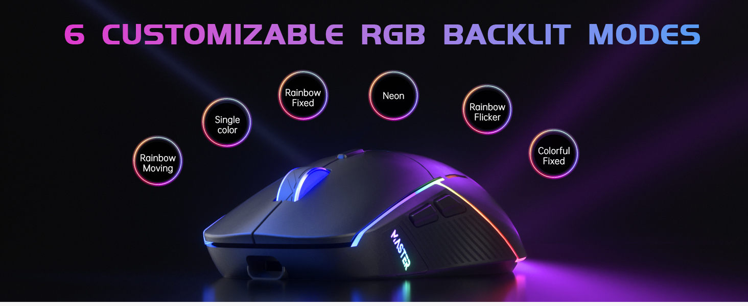 ใ๐๐ซ๐๐๐ญ๐ ๐๐จ๐ฎ๐ซ ๐๐๐ฆ๐ข๐ง๐ ๐๐ญ๐ฆ๐จ๐ฌ๐ฉ๐ก๐๐ซ๐ใThis wireless gaming mouse has 6 adjustable RGB backlight modes (Rainbow Moving, Single Color, Rainbow Fixed, Neon, Rainbow Flicker, Color Fixed). In addition, you can also adjust the brightness and speed of the light through the driver, and combine the corresponding backlight effects according to your favorite among 16.8 million colors to create a beautiful gaming environment and light up your gaming atmosphere.