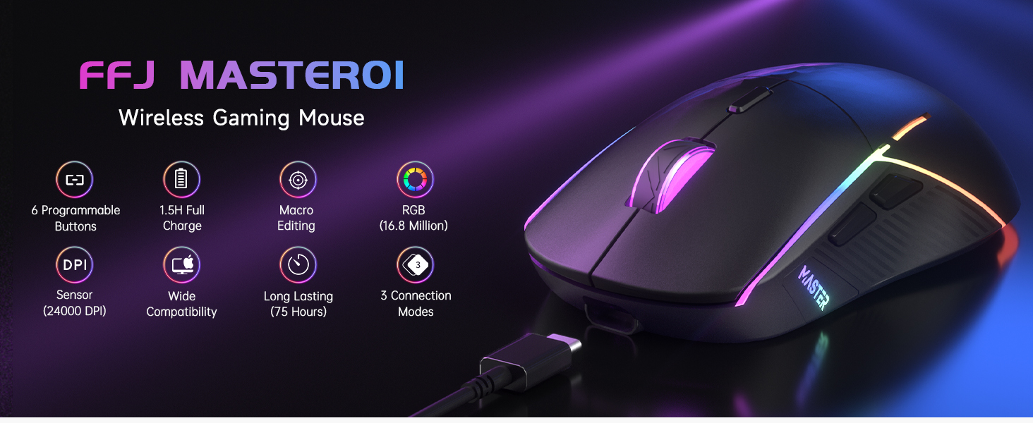 ใ๐๐๐๐ ๐๐๐ฐ ๐๐๐ซ๐ฌ๐ข๐จ๐ง & ๐ ๐๐ซ๐จ๐ ๐ซ๐๐ฆ๐ฆ๐๐๐ฅ๐ ๐๐ฎ๐ญ๐ญ๐จ๐ง๐ฌใThe 6 buttons of the FFJ Master01 wireless gaming mouse can be programmed through the driver and support macro editing. You can set the mouse buttons, assign complex macro functions, adjust DPl (50-24000), polling rate, RGB lighting effects, etc. by remapping the buttons, which greatly meets the DIY needs of game enthusiasts!