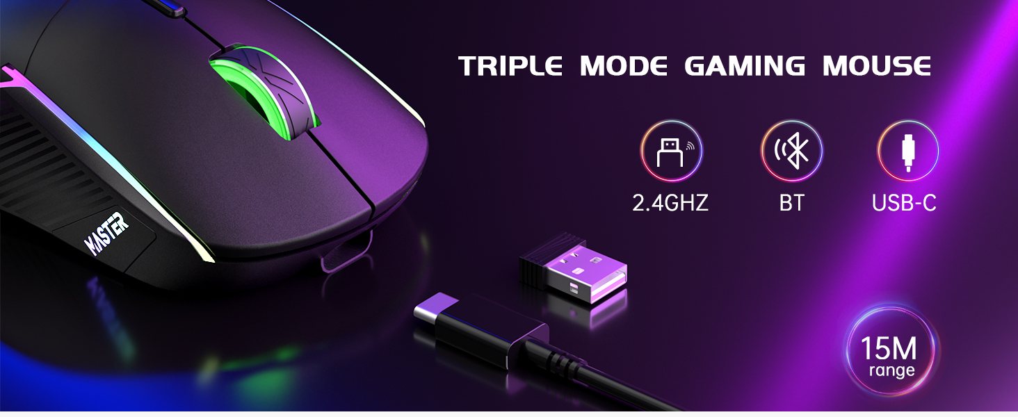 The maximum connection range of the wireless mode and Bluetooth mode of the Master01 wireless gaming mouse can reach 15M and is still stable.