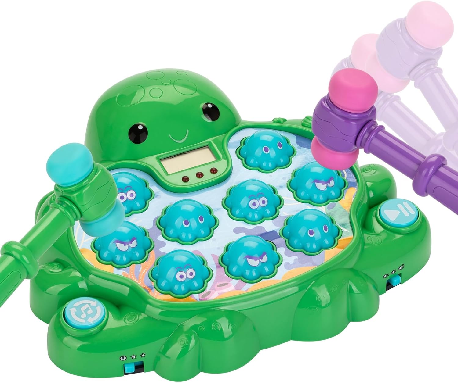 【Material clean and durability】This exciting pounding toy features two game modes (like whack a mole game!) and 26 progressively challenging speed levels. durability is paramount: it includes two soft mallets to prevent injury, odor-free materials cherish for little hands, and has rounded edges on all corners and target balls. Built tough for lasting use, the smash pan and mallets have heavy-duty construction to withstand powerful pounding. Four strong suction cups secure the base during vigorous play. (Note: batteries not included).
