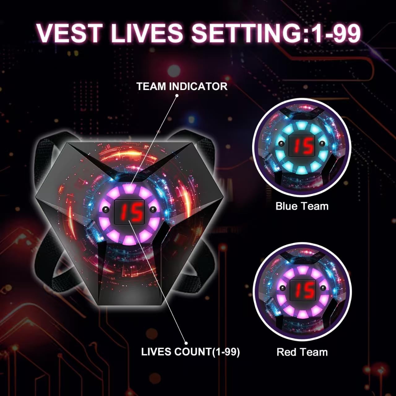 LED count (1-99) show on vest. LED screen on the vest allow you to check lives easily in the laser tag battle.Designed with adjustable comfort straps and a stretchable woven necklace strap, the vest ensures a snug and secure fit for both kids and adults.