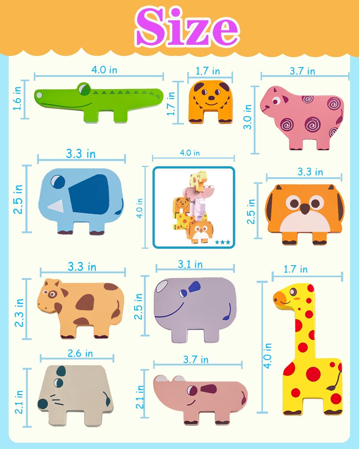【Montessori Toys for Kids】This wooden sorting & stacking toy contains 10 different shaped blocks, These are blocks with simple lines on the blocks to outline different animals: giraffe, sheep, puppy, cow, crocodile, hippo, elephant, mouse and rhino. 10 piece double-sided challenge cards with three different levels of real challenge.When babies try to match the blocks to the target or make various combinations, they can also get so much pleasure.