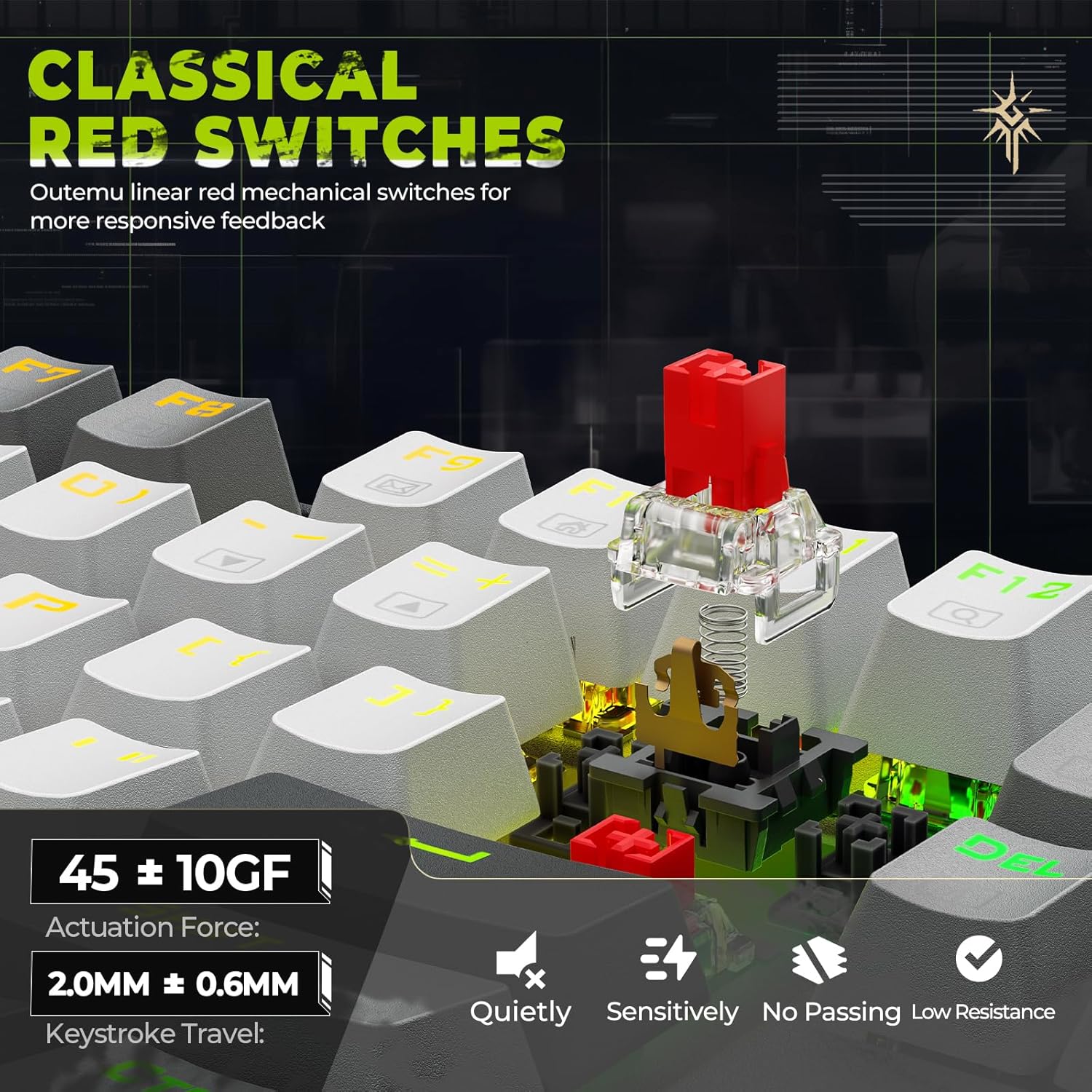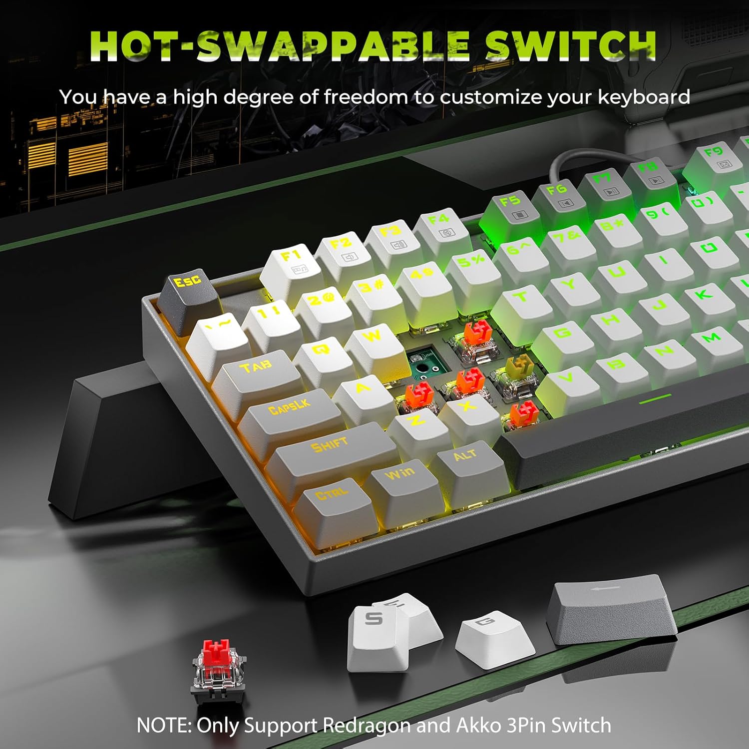 【Classical Red Switches for High-Performance Gaming】Enjoy smooth, linear keystrokes with durable red switches optimized for speed and responsiveness. The mechanical gaming keyboard’s hot-swappable design lets you replace switches effortlessly, ensuring long-term adaptability for typists and gamers. (Only supports 3-pin switches)