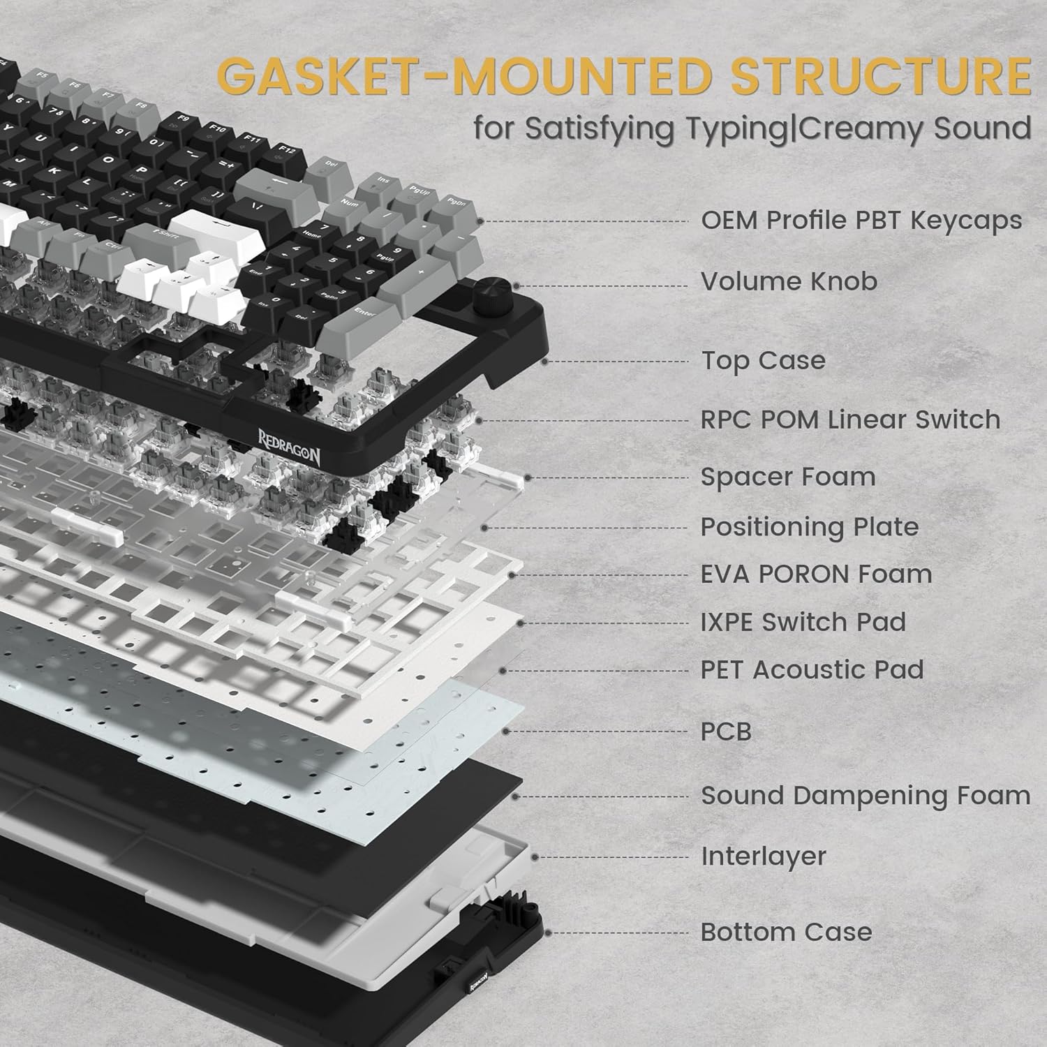 Ultimate Typing Experience – Our Redragon K742 machanical keyboard has a gasket structure filled with 5-layer sound-absorbing paddings for a silent and satisfying typing feel. Its Redragon pre-lubed RPC Linear Switch delivers creamy-sound keystrokes for unparalleled comfort during extended use. The hot swappable PCB sockets support 3-pin/5-pin switches and south-facing lights