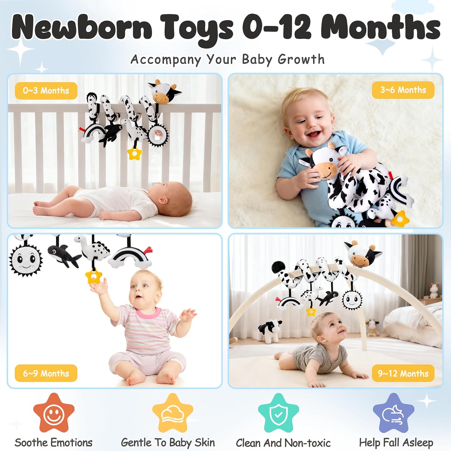 Sensory Development Toy for Newborns & Babies 0-6 Months: This high-contrast hanging toy is specially designed for newborns and infants aged 0 to 6 months, promoting early visual tracking, auditory response, and grasping skills. Featuring black and white cow stuffed spiral and arch shapes with soft textures, it stimulates your baby’s senses and encourages exploration. Perfect for baby boys and girls, this toy supports cognitive development during critical early months