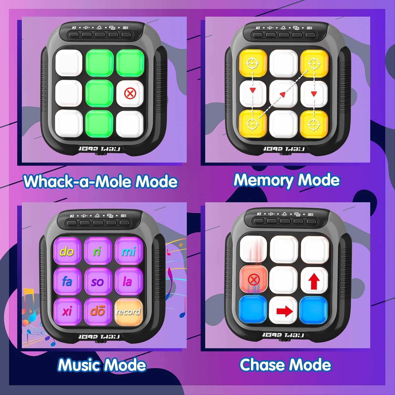 Press game with 7 modes – Including 6 game modes (Tic-Tac-Toe Mode, Tic-Tac-Toe AI Mode, Whack-a-Mole Mode, Memory Mode, Music Mode, Chase Mode) & 1 lighting mode (with 11 types of lighting rhythms). More interesting and diverse gameplay let your kids think positively and react quickly in challenging levels and exercise concentration, memory, reaction, hand-eye coordination and hands-on ability.