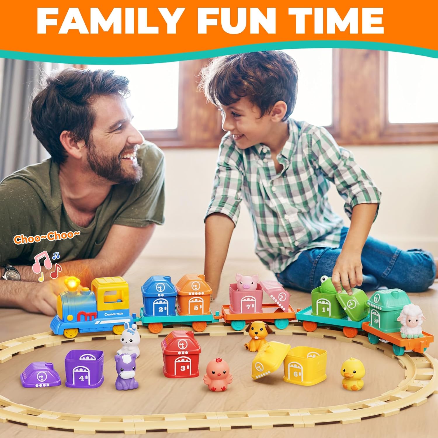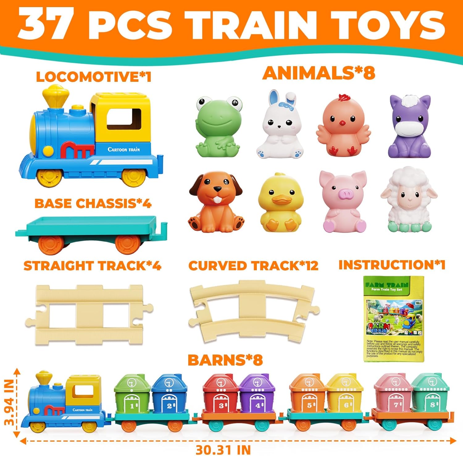 MONTESSORI TODDLER TOYS TRAIN SET: includes 1 light-up Locomotive with sounds, 4 train Base Chassis, 4 Straight & 12 Curved Tracks (forms a complete oval), 8 colorful Barns, & 8 silicone Animals. This train set for toddlers 2-4 helps toddlers master numbers, color, and farm animal. Our toddler will develop creativity and imagination while building tracks, improve hand-eye coordination through interactive play. This train set is a great montessori toys for 1, 2 year old–all while building early learning skills the Montessori way!