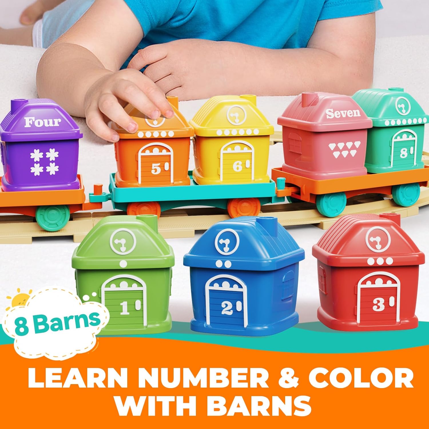 LEARNING NUMBERS & COLORS WITH BARNS: This engaging educational set features 8 vibrant barns to teach number recognition and color identification. Our toddler will strengthen number & color skills by matching barns to corresponding roofs. This train set for toddlers 2-4 is great learning toys for 1+ 2+ year olds. While developing fine motor control and hand-eye coordination through loading, stacking, and sorting activities – making foundational learning fun and interactive!
