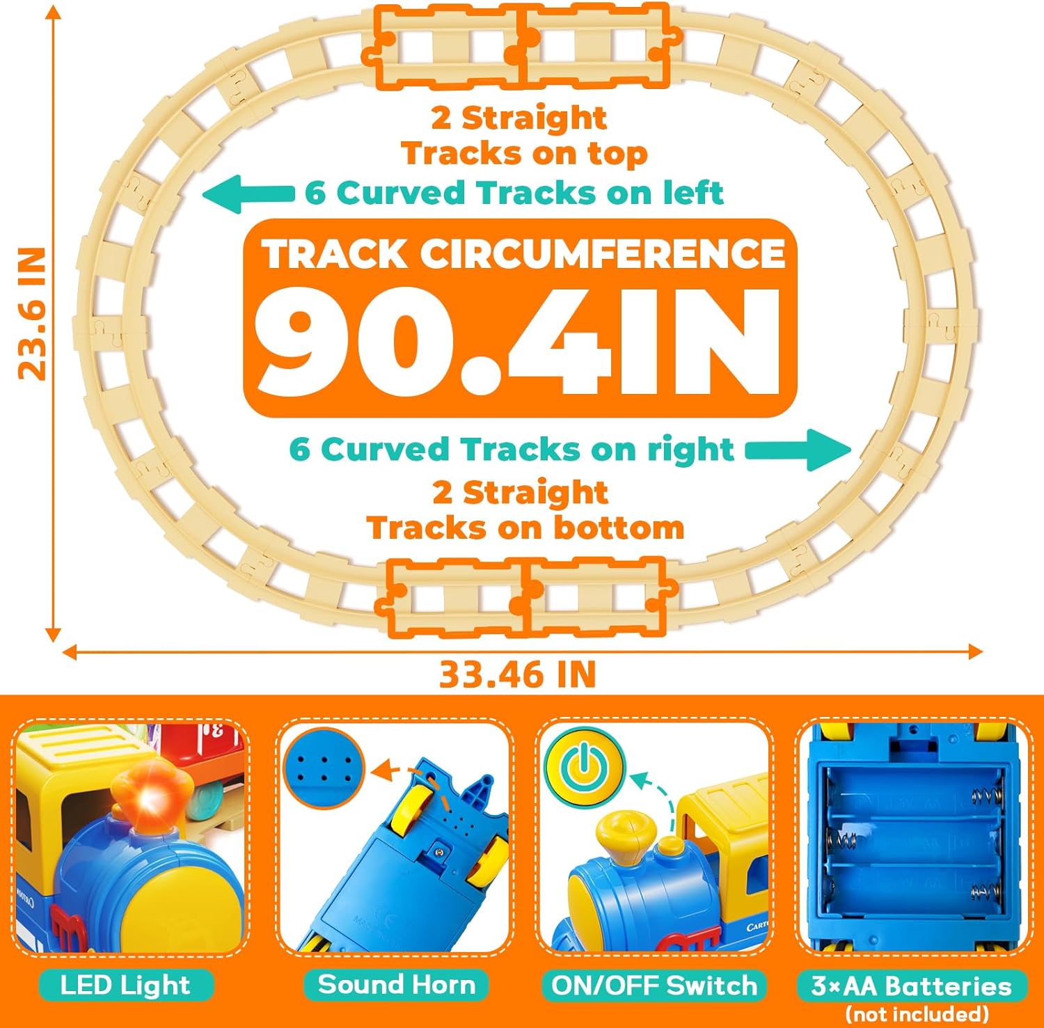 MY FIRST FARM TRAIN SET: This train set for toddlers 2-4 features easy-to-connect tracks that form a giant 90-inch loop for immersive play. Simply install 3 AA batteries (not included) to power the automatic engine that runs smoothly on both tracks and flat surfaces. Enhanced with realistic choo-choo sounds and lights, it delivers multi-sensory play that captivates both toddler boys girls. Perfect toys gifts for 1, 2 year old boy girl