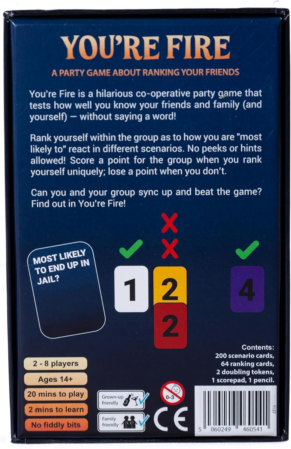 You’re Fire is a hilarious co-operative party game about syncing with your team to rank yourself and your friends! Test how well you know your friends and family (and yourself) — without saying a word! Rank yourself within the group as to how you are “most likely to” react in different scenarios. Score a point for the group when you rank yourself uniquely; lose a point when you don’t.