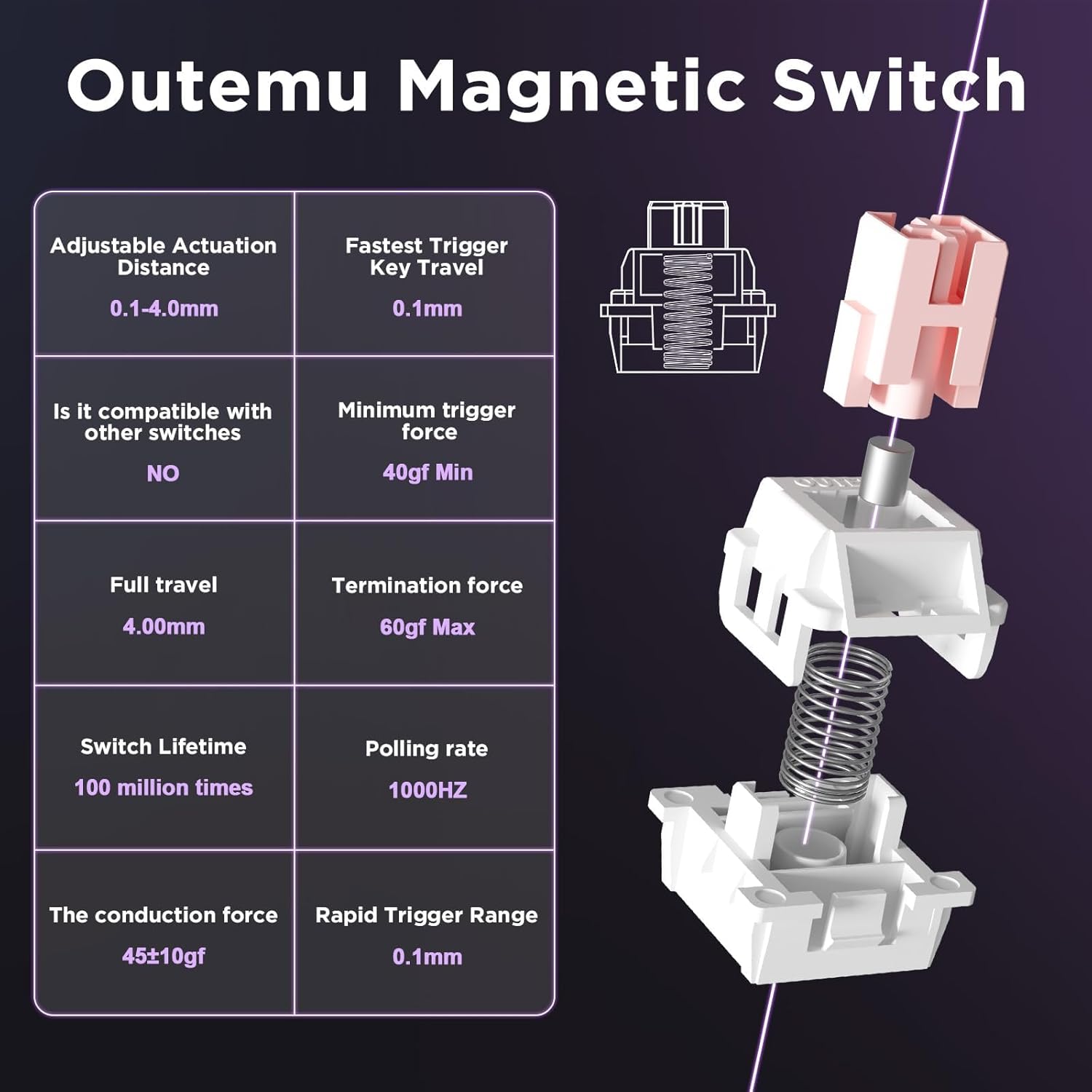Advanced Hall Effect Magnetic Switches: RT75 keyboard utilizes Outemu magnetic switches, which leverage the Hall Effect to register keystrokes. It can eliminate physical contact between the keycap and switch, resulting in greater durability, longer lifespan, faster response times, and reduced wear and tear. This magnetic switch keyboard feature enhances your gaming efficiency, making it one of the fastest gaming keyboards available